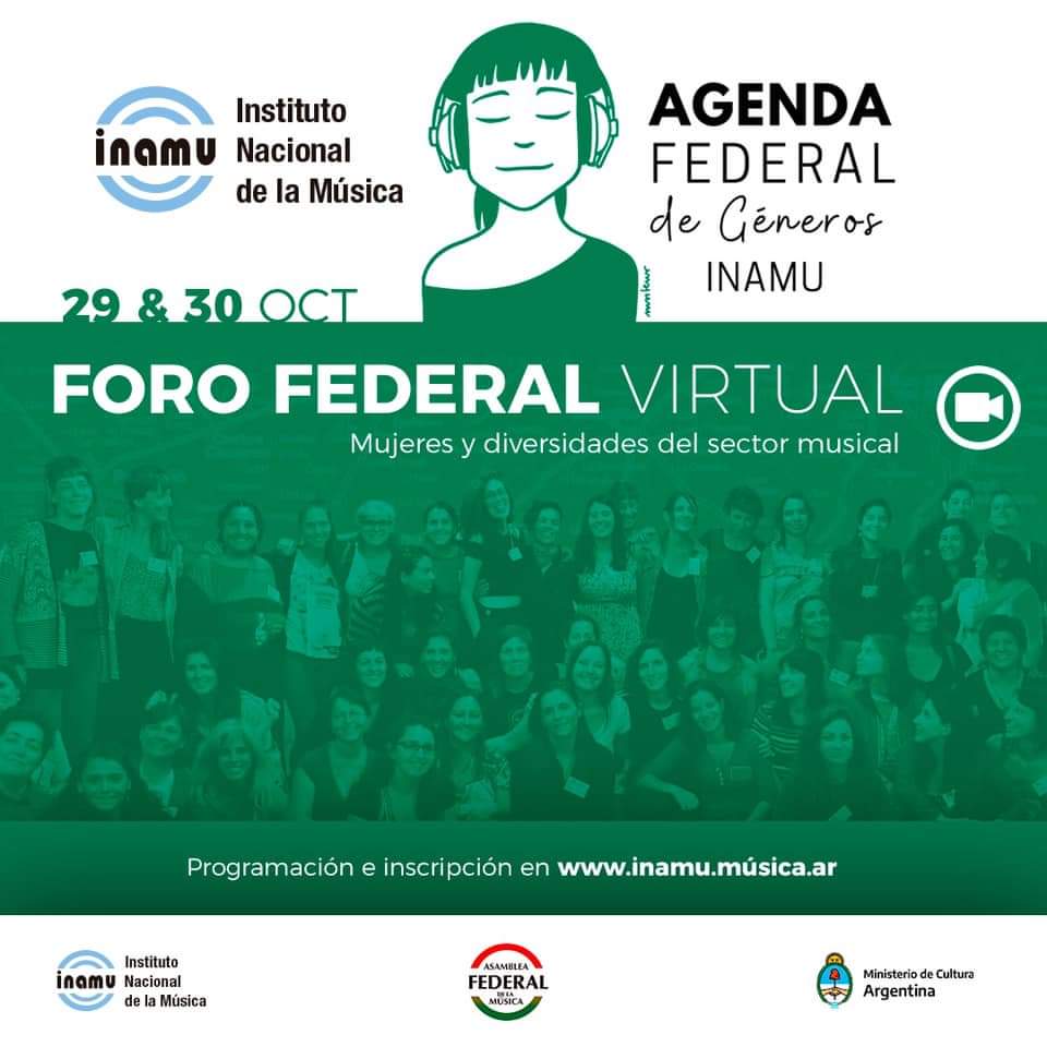 En este contexto desafiante provocado por la pandemia del COVID 19 en el mundo, y haciendo uso de las herramientas de la virtualidad, el INAMU llevará adelante el próximo FORO FEDERAL VIRTUAL los días 29 y 30 de octubre para mujeres y diversidades del sector musical.