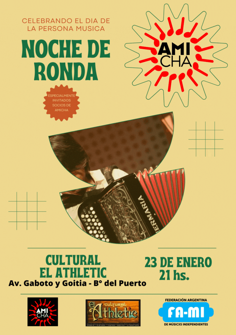 En el marco de la Persona Música…este lunes 23 de enero, desde las 21hs, estaremos celebrando en el CULTURAL EL ATHLETIC (Gaboto y Goitia) de la ciudad de Barranqueras una NOCHE DE RONDA, donde compartiremos una cena a las canasta, canciones y la enchamigada de nuestra asociación.