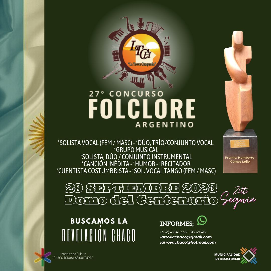 Se viene la 27º edición del Concurso de Foclore Argentino, un evento tradicional y destacado de la provincia del Chaco. El mismo se realizará el viernes 29 de septiembre desde las 20hs en el Domo del Centenario Zitto Segovia. El concurso buscará la Revelación Chaco 2023.