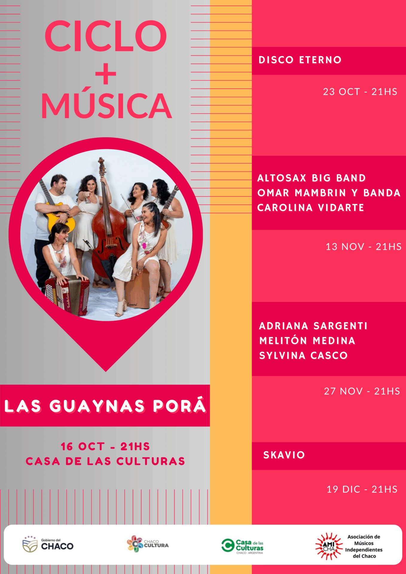 La Asociación de Músicos Independientes presenta el ciclo +MUSICA, que se llevará a cabo, entre los meses de octubre – noviembre y diciembre a las 21hs, en la Casa de las Culturas de la ciudad de Resistencia.